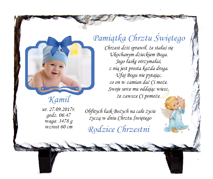Nasza firma chciałaby zaoferować Państwu kamień granitowy – foto granit. Nadruk wykonywany jest w sprawdzonej technologii – metodą sublimacji, która pozwala na trwały i wyrazisty kolor nadruku. Foto granit jest idealnym, oryginalnym prezentem na pamiątkę Chrztu Świętego lub ważną uroczystość.